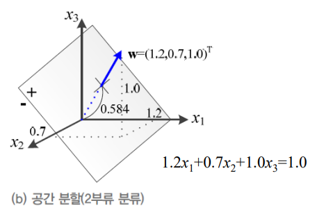 이 때 2차원은 결정 직선을 이용해서 분류를 했다면, 3차원 공간에서는 결정 평면을 이용하며, W에 수직이고 T/|w|2만큼 떨어져 있다고 볼 수 있다.