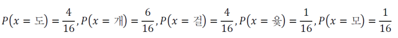 다음과 같은 윷이 있다고 가정을 합시다. 5가지중 한 값을 가지게 되는 확률 변수는 x이고, x의 정의역은 {도, 개, 걸, 윷, 모}가 됩니다. 그리고 이에 대한 확률 분포를 구하면 다음과 같을 것입니다.