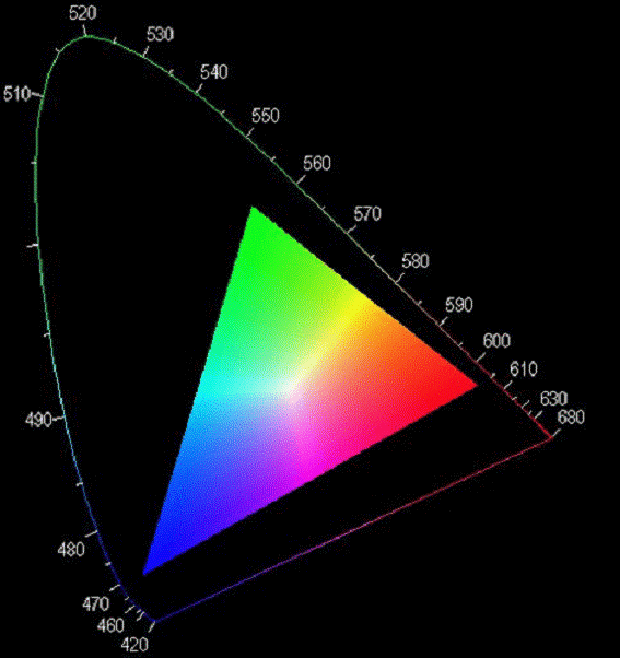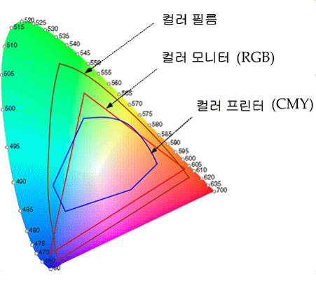 하지만 사전에 언급했듯이 색을 이렇게 정의를 했다 쳐도 모든 컴퓨터의 장비나 IO에서 모두 표현해낼 수는 없다. 아래의 사진의 예시처럼 이 CIE의 색의 범주 중 전형적인 RGB 컬러 모델을 사용하는 컬러 모니터나 CMY 컬러 모델을 사용하는 컬러 모델은 다음과 같은 색 정도 까지만 표현해낼 수 있다.
