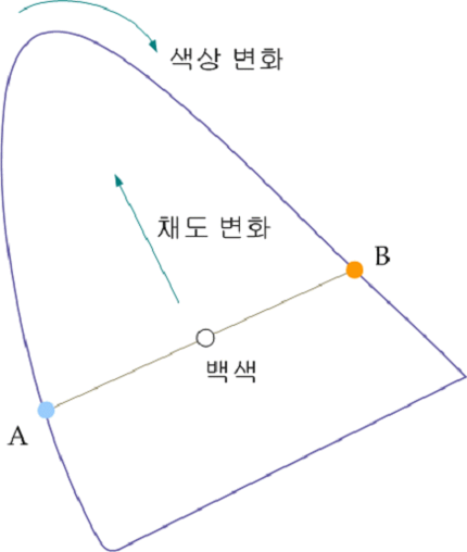 이 때 표현할 수 있는 색상을 모두 총망라한 것을 색 범주라고 하며 오른쪽으로 x축, 위로는 y축으로써 값을 변화시키며 나온 값들을 표현한 것이다. 또 오른쪽 사진을 보면 알 수 있듯이 바깥 경계선을 따라서 색상이 변하며, 중앙의 백색으로부터 멀어질수록 채도가 점점 진해지는 것을 왼쪽 사진을 통해서 확인할 수 있다. 또한 오른쪽 사진의 A와 B처럼 백색을 기점으로 반대에 있는 색들은 보색으로써 두 색을 섞으며 빛의 특성처럼 백색이 나온다.
