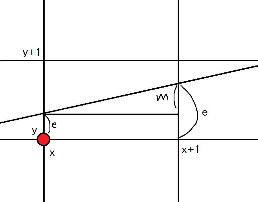 다음과 같이 벡터가 좌표계를 지나가는 경우가 있다. 이 때 만약 x + 1상에서 y 값이 0.5보다 큰 경우 y + 1 이보다 작은 경우 y에 그리게 된다 즉, 이 0.5보다 큰 지 작은지는 체크하기 위해 만들어진 변수가 바로 e이며, x의 e 값과 x + 1의 e값을 비교하기 위해 나온 변수가 m이다.